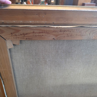 My husband and I don't really make purchases that size without talking with eachother, so I asked if I could take a few photos of it to show him. He agreed, let me snap a few photos with my phone, and then turned it around to show me the back. There was more writing, more clues about where this painting came from. (I later learned in the art world that's called provenance, and yes, I said that in my head in a fancy French accent.)